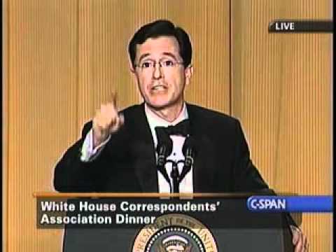 Parado a pocos metros de George Bush, frente a un público de celebridades, políticos y miembros de la prensa de la Casa Blanca, Colbert realizó una controvertida rutina en contra del presidente y los medios. Colbert habló interpretando a su personaje del popular programa de Comedy Central, The Colbert Report, que es una parodia de comentaristas conservadores como Bill O'Reilly y Sean Hannity.